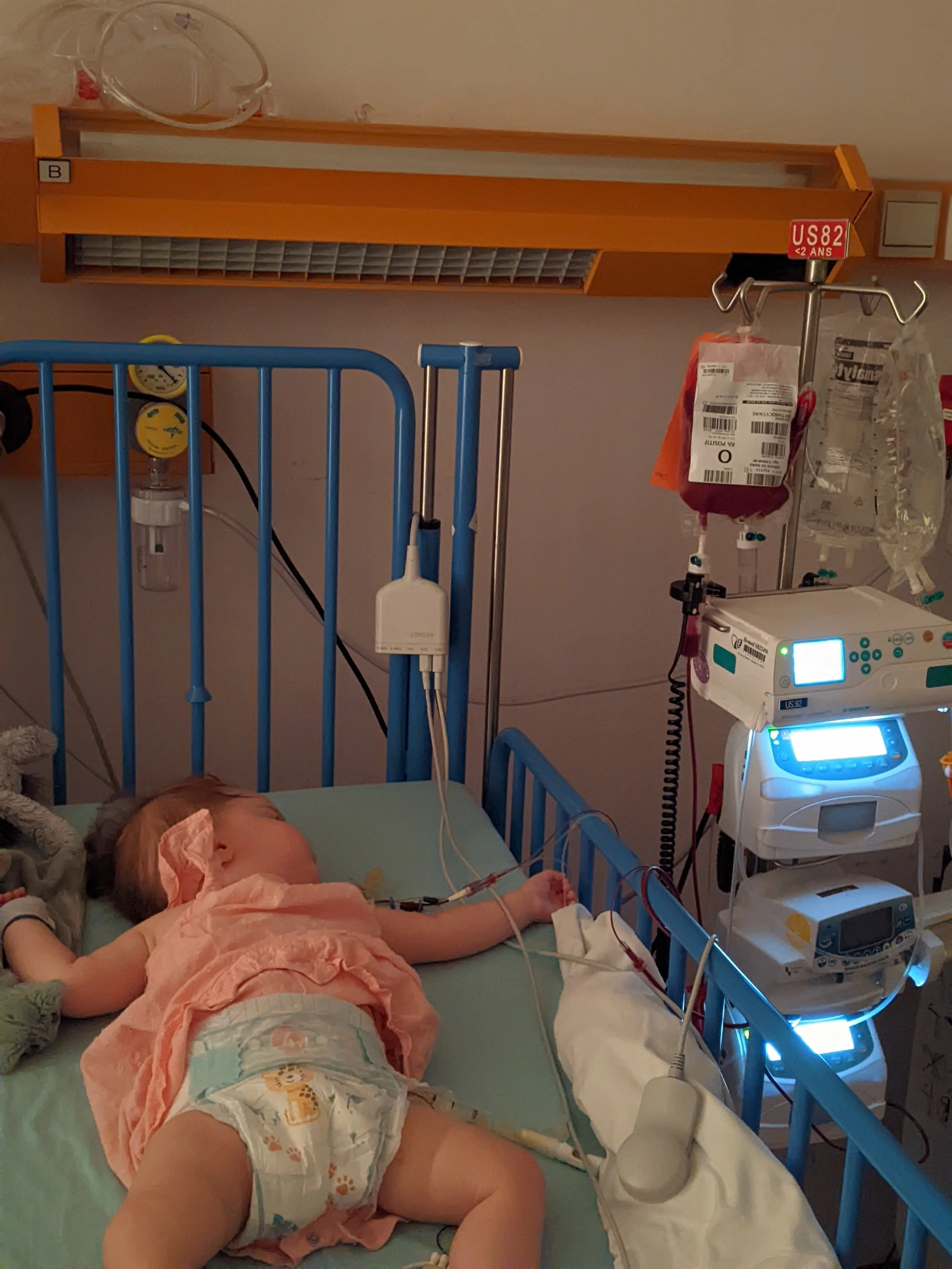 Après toutes les prises de sang effectuées à intervalles réguliers pour contrôler l'évolution du greffon, ce n'est pas étonnant que son hémoglobine aie chuté. Ben oui, dans une petite grenouille comme elle y en a pas des litres. Et donc on l'a transfusée : l'infirmière est allée chercher une poche, l'a branchée à sa voie centrale, et 30 minutes après c'était terminé.